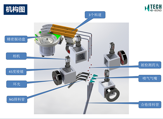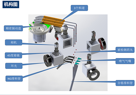 在藥粒檢測過程中,需進(jìn)行藥粒上白點(diǎn)、藥粒圓不圓、藥粒的粘連、藥粒的色澤正確等功能,檢測完成后輸出OK、NG信號,在排廢位進(jìn)行剔除動(dòng)作。系統(tǒng)采用進(jìn)口工業(yè)相機(jī)快速獲取產(chǎn)品圖像,通過圖像識(shí)別、分析和計(jì)算,輸出檢測信號。 二、【藥粒檢測系統(tǒng)結(jié)構(gòu)圖】