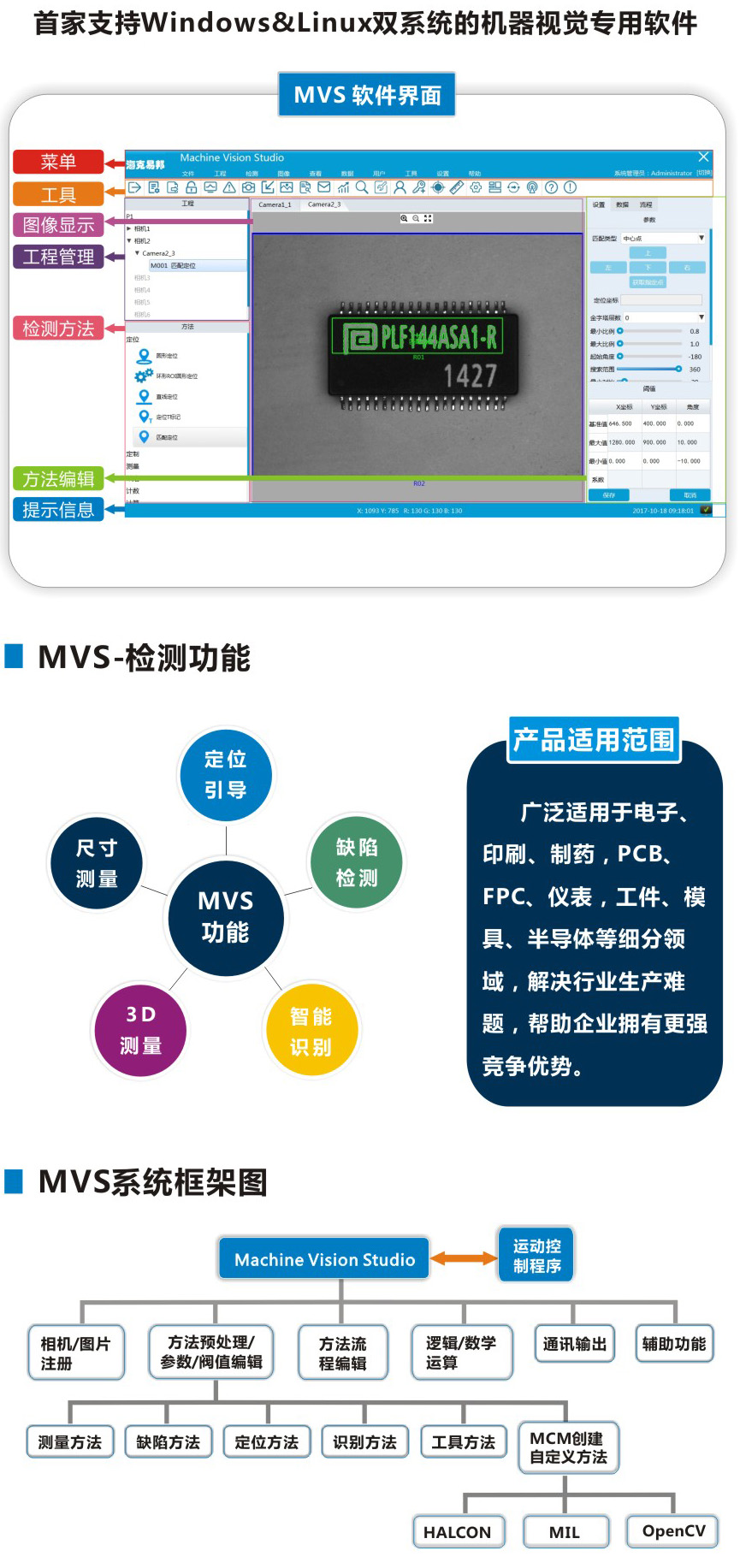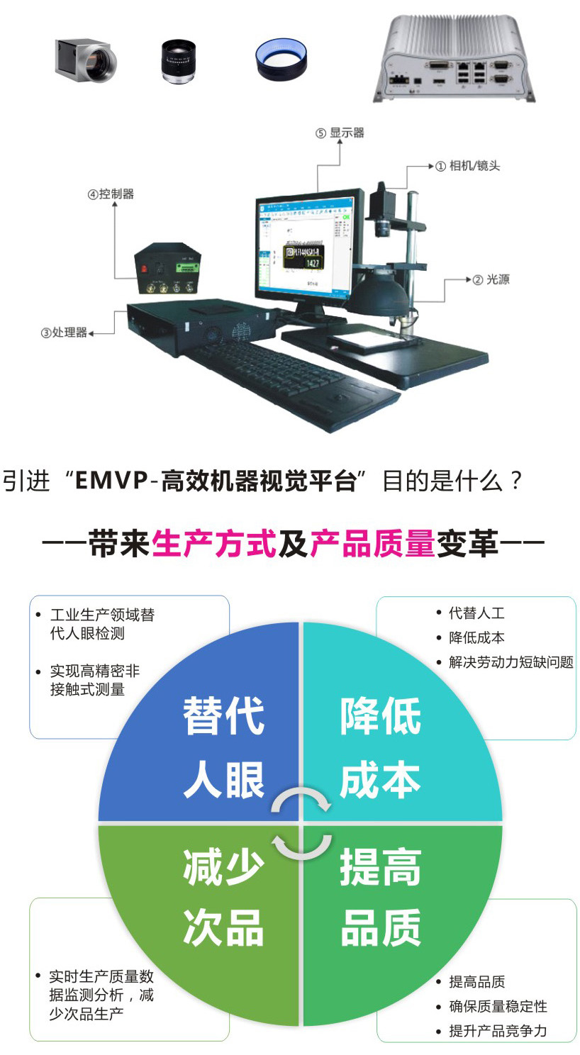 EMVP開(kāi)放式機(jī)器視覺(jué)平臺(tái)是海克易邦獨(dú)立自主開(kāi)發(fā)的機(jī)器視覺(jué)產(chǎn)品。該產(chǎn)品集軟件和硬件于一體,整合本公司在機(jī)器視覺(jué)行業(yè)十年技術(shù)積累,同時(shí)結(jié)合各類視覺(jué)檢測(cè)的實(shí)際需求而推出,為客戶提供最優(yōu)的機(jī)器視覺(jué)解決方案。產(chǎn)品軟件最新推出MVS版本,操作更加簡(jiǎn)單,設(shè)置更加靈活,同時(shí)支持高級(jí)用戶二次開(kāi)發(fā)。EMVP機(jī)器視覺(jué)平臺(tái)具有集成度高、功能豐富、穩(wěn)定可靠等特點(diǎn),適用于缺陷檢測(cè)、尺寸測(cè)量、定位引導(dǎo)、字符識(shí)別、平整度檢測(cè)等機(jī)器視覺(jué)應(yīng)用領(lǐng)域。
